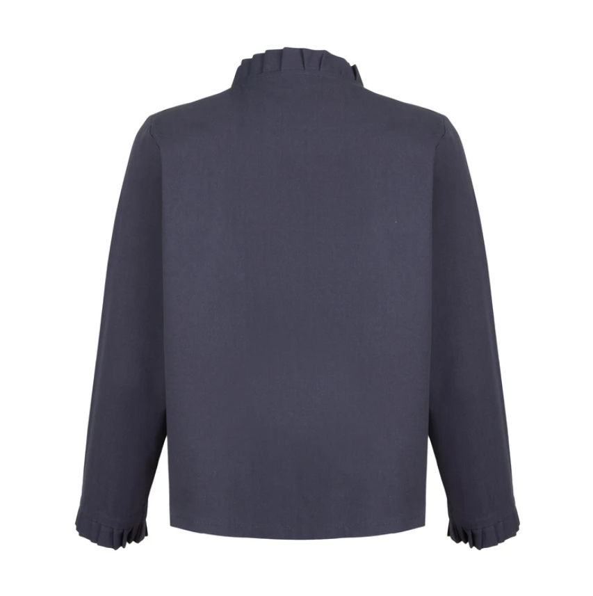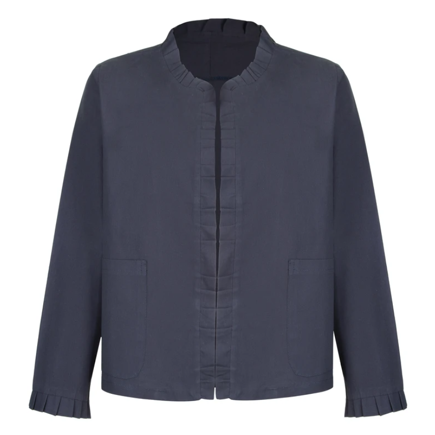 کت آستین بلند با لبههای چیندار در آستین، یقه و جلوی کار، دارای دو جیب در پایین دو طرف.