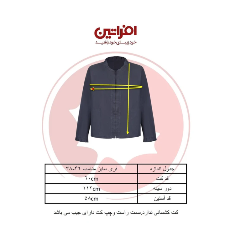 جزئیات: کت آستین بلند با لبههای چیندار در آستین، یقه و جلوی کار، دارای دو جیب در پایین دو طرف.